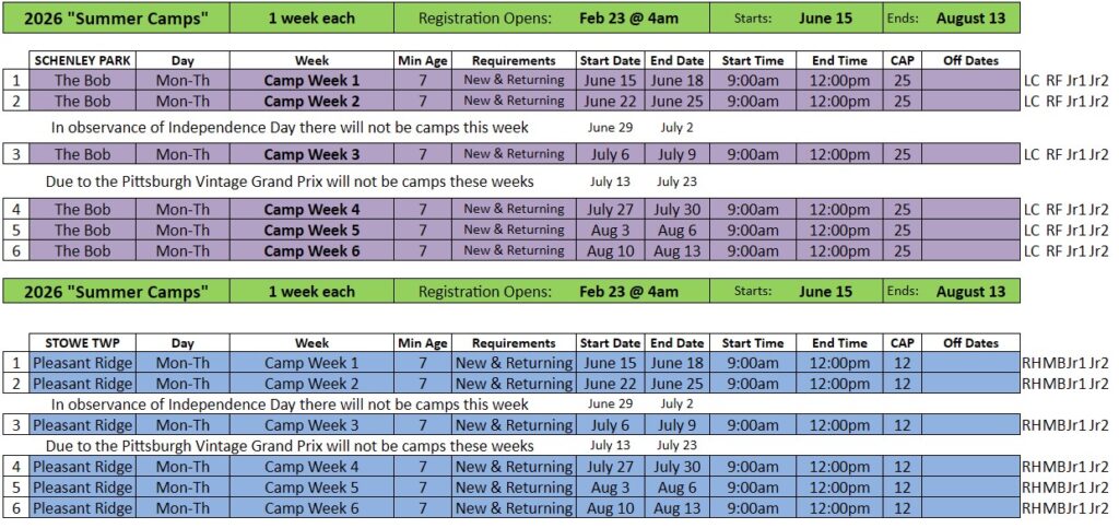 - Camps start the week of June 15 and end the week of August 13.