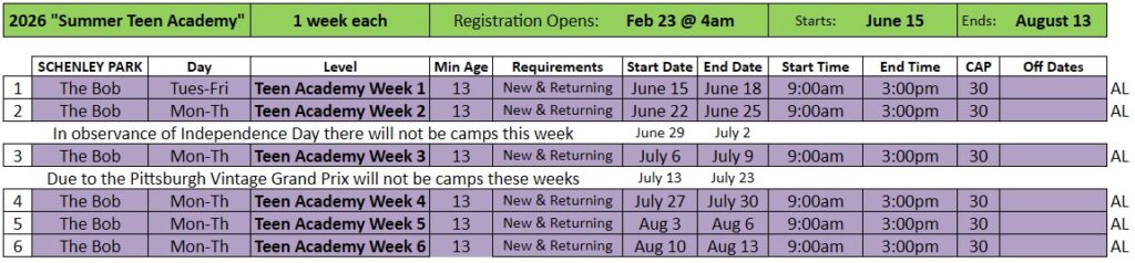 - Teen Academy starts June 15 and ends the week of August 13.